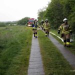 Als weitere Herausforderung der Übungslage breitete sich das Feuer in der Umgebung des Bauwagens aus, was in unserem Moor durchaus realistisch ist. Insbesondere mit dem Torf im Boden kann sich das Feuer unter der Oberfläche ausbreiten und an anderer Stelle wieder zum Vorschein kommen.